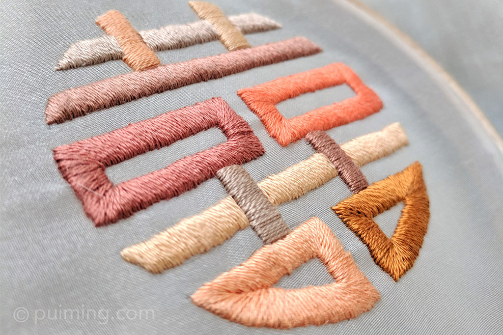 Double Happiness, or “囍” in Chinese, is a traditional symbol celebrating marriage. I created this embroidery as a small, exotic blessing for an Irish couple getting married, using raised satin stitch with DMC cotton threads in warm and celebratory colour tones.