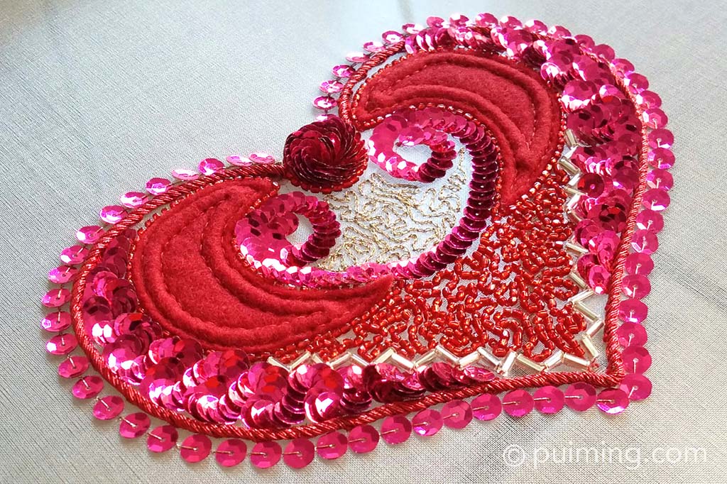 This glamorous heart is my first completed piece in learning haute couture embroidery with Elisabeth Gasbarre, an amazing teacher and woman whom I feel so grateful to have met. The feeling of stitching with a Lunéville hook on transparent silk organza is incredible.
