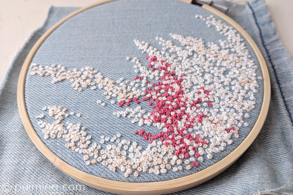 This embroidery piece draws inspiration from Hanami, the Japanese tradition of flower viewing. Envisioning a breathtaking scene of fully bloomed sakura (cherry blossoms) I once witnessed in Kyoto, I allowed my hands to move freely across the recycled denim fabric, creating French knots with DMC cotton threads. The resulting piece is picturesque, with the French knots evoking the delicate sakura against the denim sky.