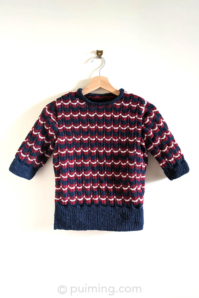 I love vintage patterns. This classic 1945 Victory Jumper is an original pattern from 1940s Britain. During the Second World War, women across the country were encouraged to contribute to the war effort by knitting, particularly for the troops, and many patterns were distributed for free. This pattern, along with several others, is now freely accessible on the V&A’s website. While the original yarns suggested for knitting the jumper are discontinued, I find the Irish Studio Donegal Darnie yarns (Navy, Rowan Berry, and White) to be good alternatives.