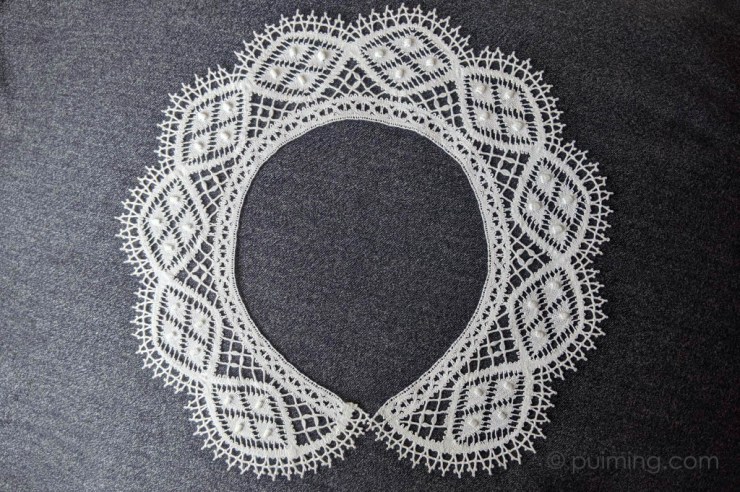 This beautiful pattern is adapted from an old lace collar by Christine Springett. It requires 45 pairs of bobbins to complete. The plaits and picots on the curved edges enhance its elegance, and the raised tallies add vividness to the collar.