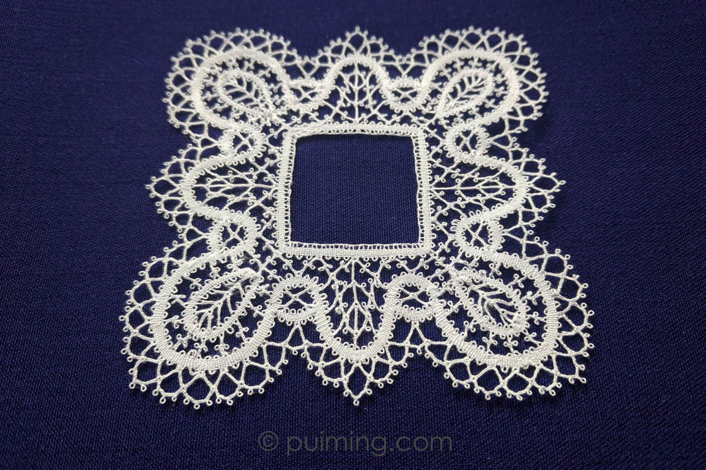 This attractive pattern is adapted from an antique pricking by Christine Springett. Over 40 pairs of bobbins were used. In the world of bobbin lace, the smaller the pattern, the potentially more difficult it is to make. Having broken the fine cotton threads many times, I eventually managed to control the tension better. How about using this delicate piece to frame a small picture?