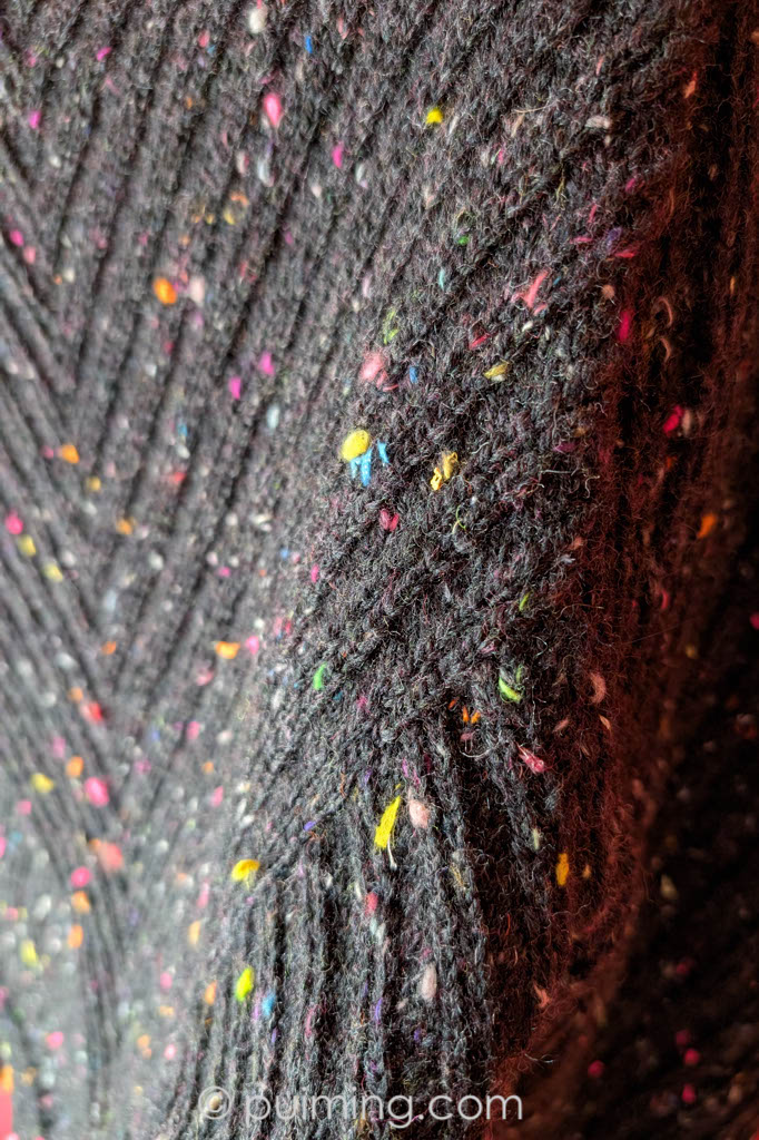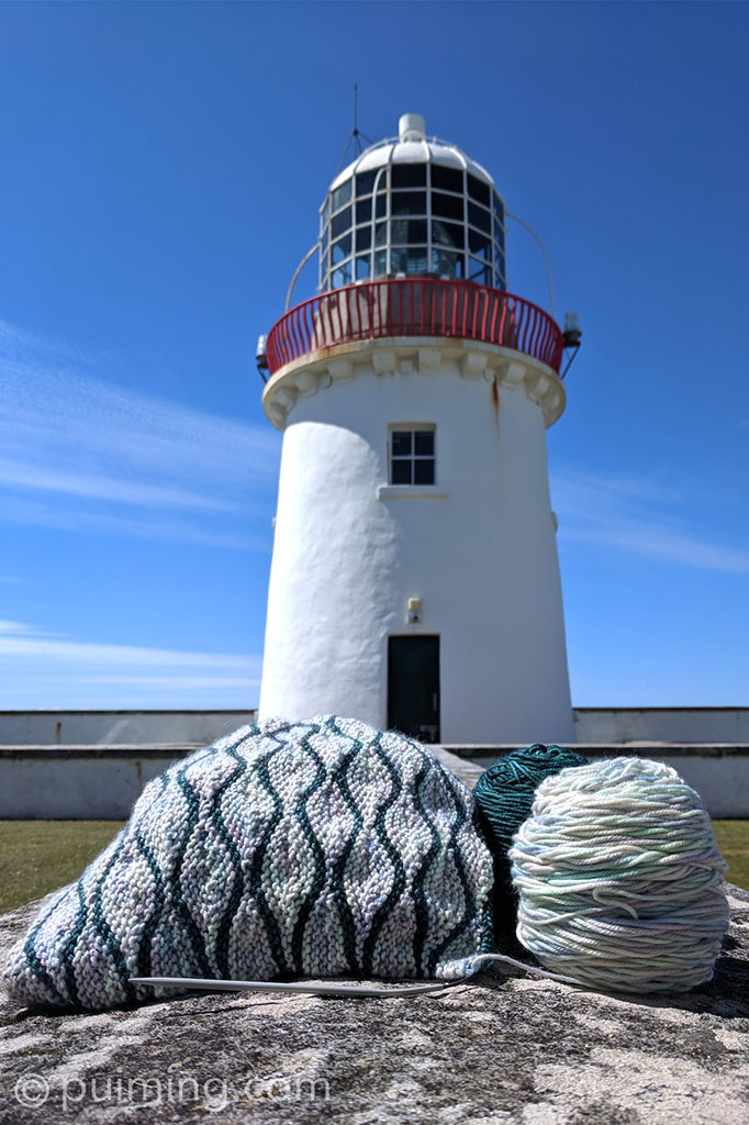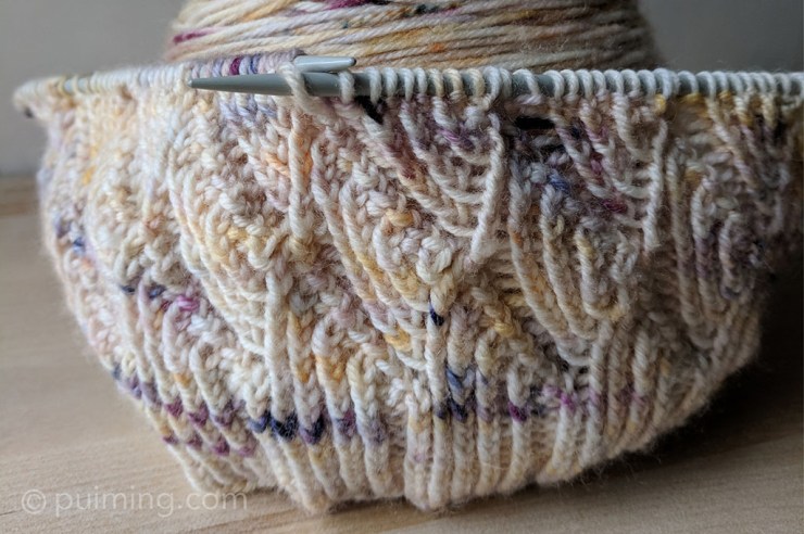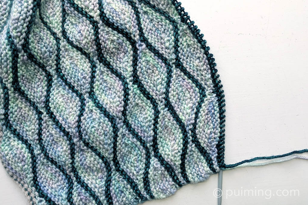 I found this beautiful rib and fan pattern at Drops Design called Winter Dunes and decided to give it a go. I’m using the hand-dyed variegated Irish Drury DK from Townhouse Yarns, which I bought at This Is Knit in Dublin. This double-knit yarn comprises 80% superwash merino, 10% cashmere, and 10% nylon. It’s a pity that winter is gone and I’m still in the process of knitting—can’t wait to finish it and wear it.