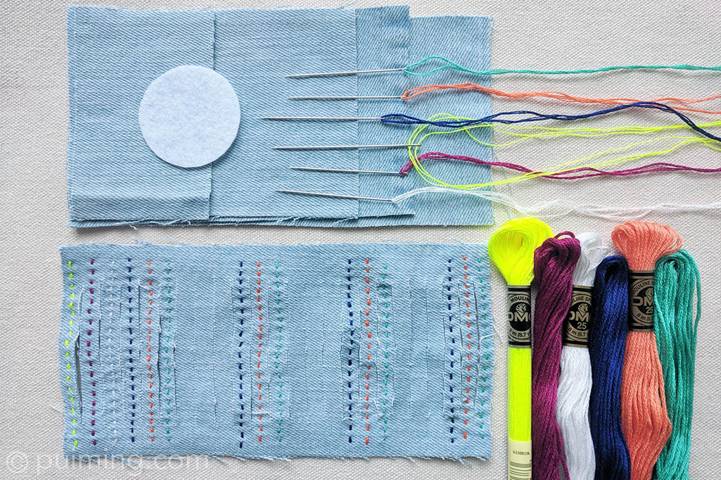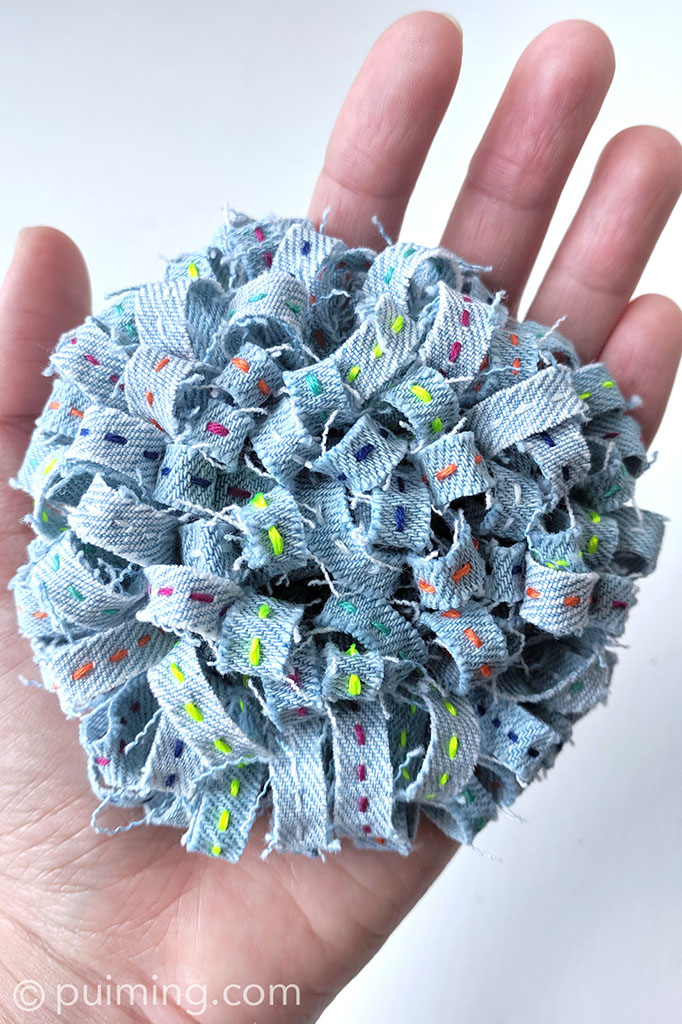 I was reviewing my previous work when an idea popped into my mind: how about putting a twist on the felt flower brooch that I made earlier, using recycled denim fabric from my old and torn pair of jeans, plus a bit of stitching with colourful DMC cotton threads?