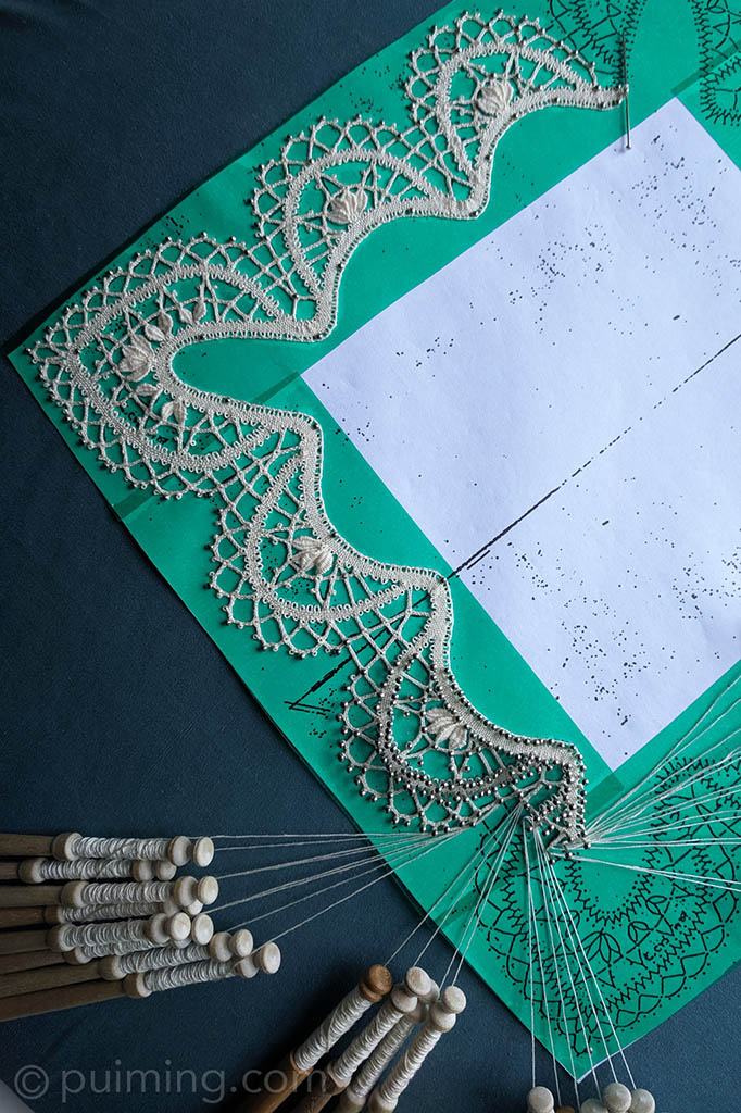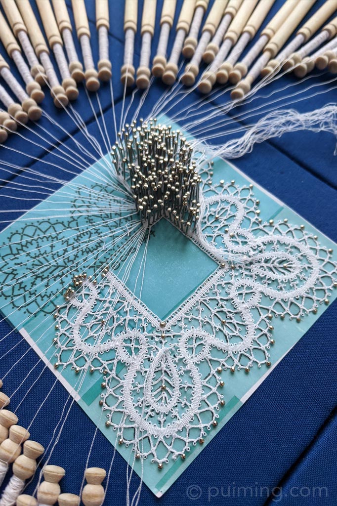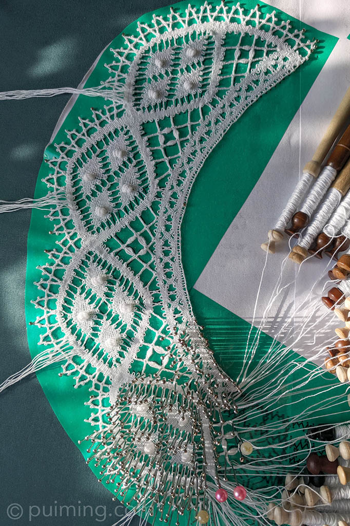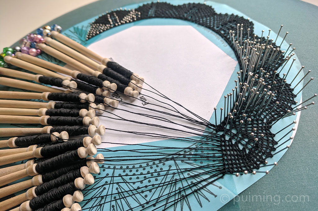 I started this antique diamond lace collar pattern prepared by Christine Springett a few months ago. I’m excited to learn the new technique for making the raised tallies, which feels like magic to me. This is indeed my first time handling 45 pairs of bobbins—I’d better concentrate!