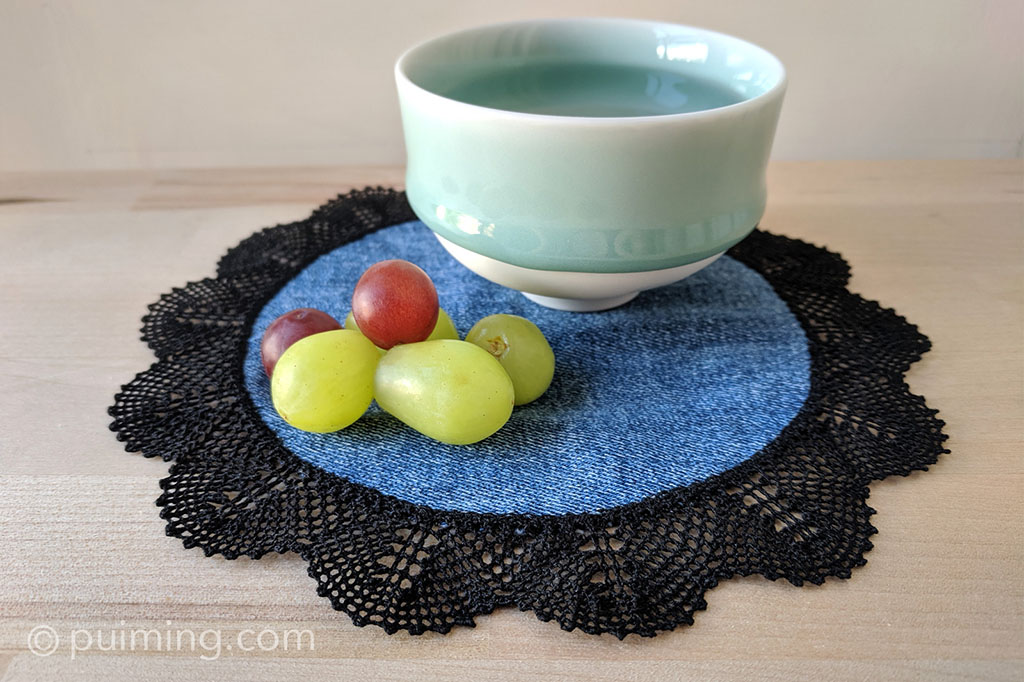 While I initially thought making the torchon was the most difficult part, mounting it onto the slightly stretchy recycled denim fabric to serve as a mat proved even more challenging, and I struggled for quite a while to complete it. Now, however, I have a new mat for my afternoon tea.