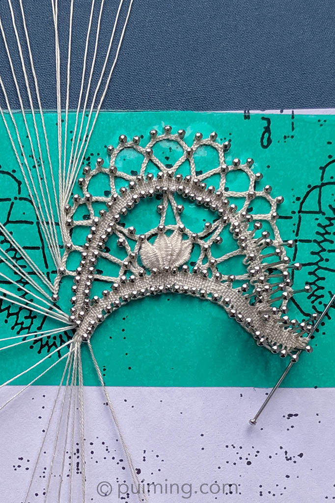 For the Bedfordshire teardrop edging, the pattern is adapted from an antique pricking by Christine Springett. In the world of bobbin lace, I find that the smaller the pattern, the potentially more difficult it is to make. Having broken the fine cotton threads many times, I’ve managed to gain better tension control.