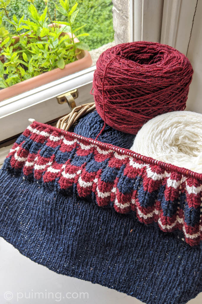 Flowers are starting to bloom—a welcome sign of spring! I’m on track to finish this classic 1945 Victory Jumper, one of the original 1940s patterns from Britain, now freely accessible on the V&A website. The Irish Studio Donegal Darnie yarns (in Navy, Rowan Berry, and White) are excellent alternatives to the suggested yarns in the pattern.