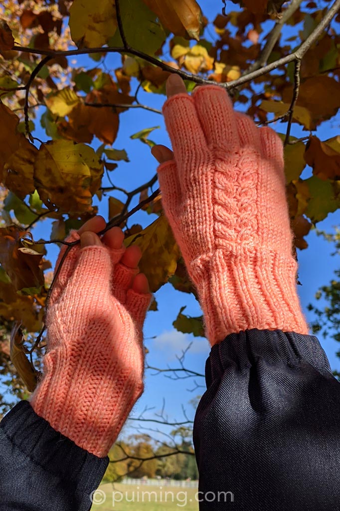 On the other hand, the peachy fingerless gloves are finished! I’m grateful to have them to keep my fingers warm.