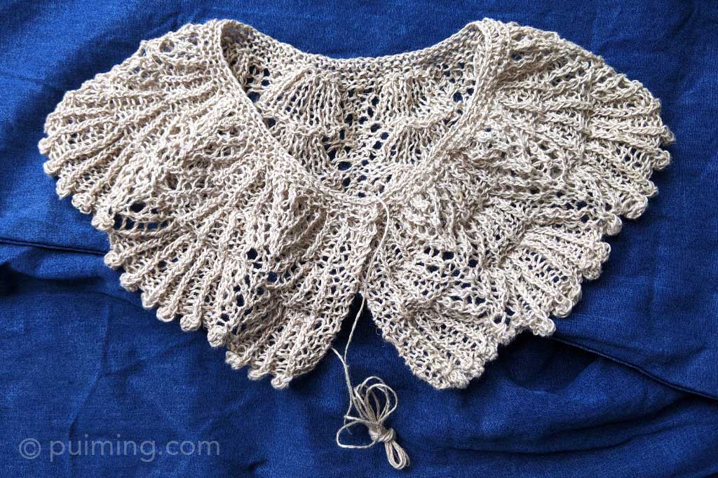 Lace knitting is always exciting because the lace pattern usually won’t be clearly revealed until you’ve invested weeks, if not months, of effort and then properly bathed and blocked the piece. I challenged myself by knitting this elegant lace collar, a pattern obtained from the book Japanese Knitting Stitch Bible: 260 Exquisite Patterns by Hitomi Shida. I used 100% linen yarn from Växbo Lin in Sweden, as I intend for it to be worn in hot and humid weather. This is how it looks before blocking; the finished picture will be added to my Knitting Collection page.