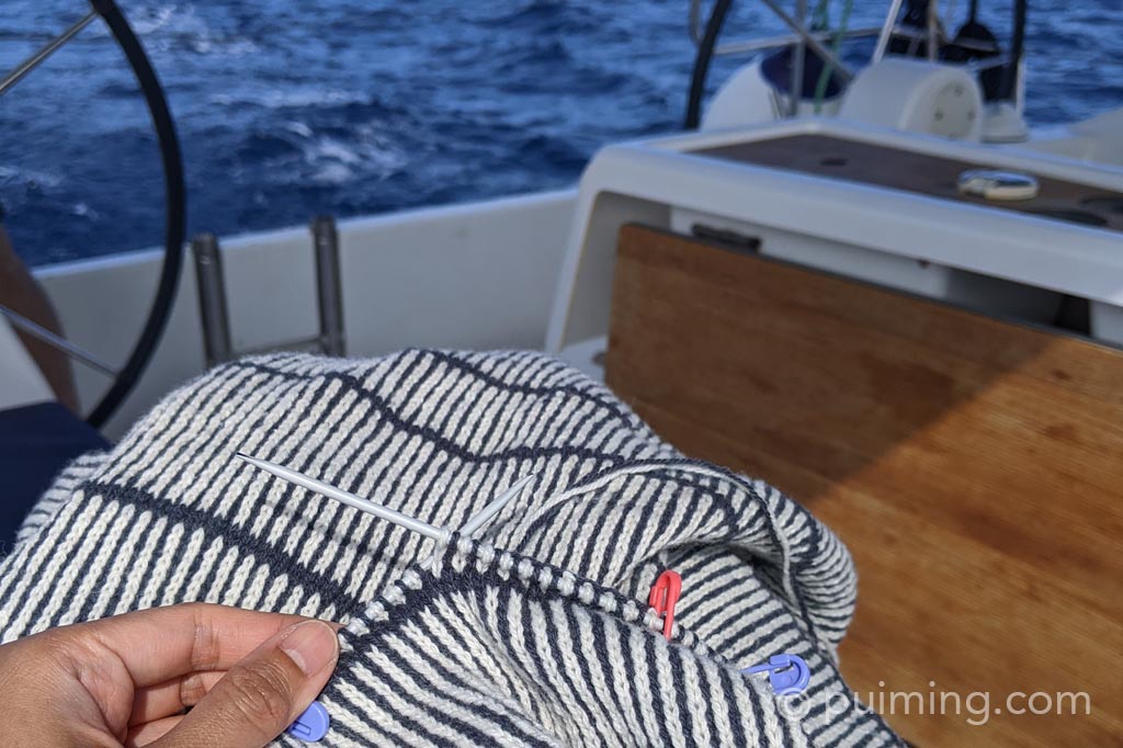 Now the chill in the air reminds me that summer is gone, and none of my projects are complete… I know! I didn’t, however, forget about knitting during my vacation sailing in the Adriatic Sea, as this picture proves.