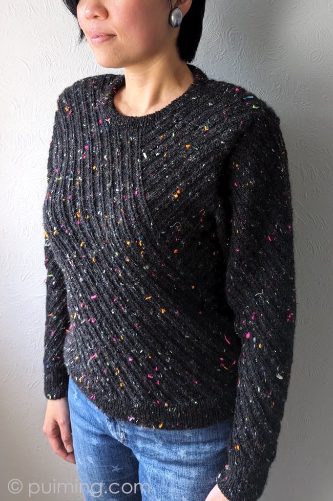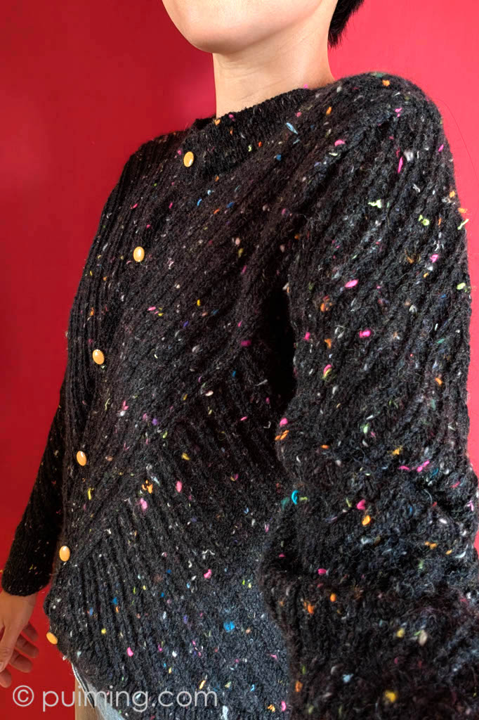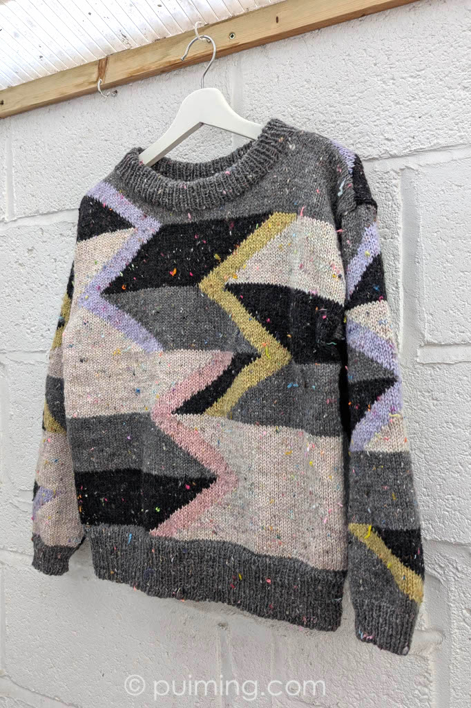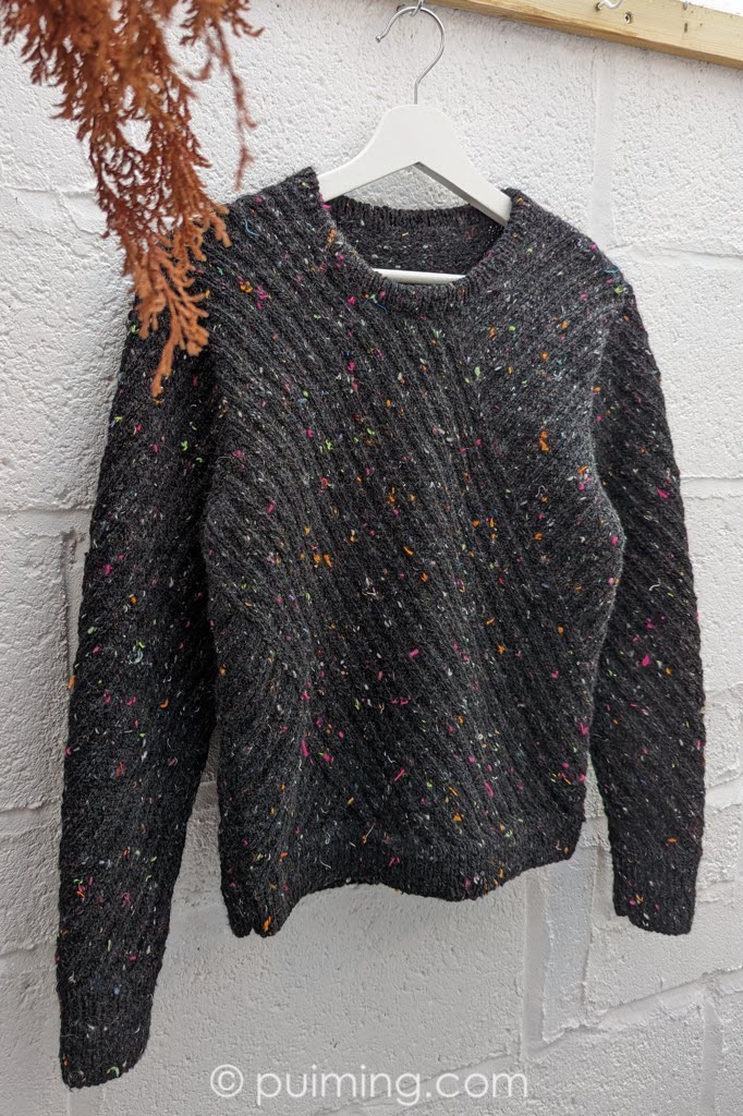 Les Étoiles’ is my self-designed sweater, knitted with positive ease, a longer body length, and a wider shoulder width (designed to accommodate shoulder pads). Together with its distinctive diagonal stripes, ‘Les Étoiles’ resembles the bold and powerful fashion style of the 1980s. Splashes of colorful thread waste, blended into the partly recycled wool Tweedy Noir by Hedgehog Fibres, simply add funkiness to the piece. I can imagine myself wearing it to disco dancing!